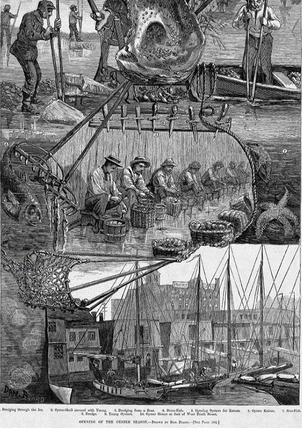 In 1853, the New York Herald reported that the largest proportion of all East River oysters used in New York came from City Island, “where there are extensive artificial and natural beds.” And in 1881, the U.S. government’s Fisheries Bureau gave credit to City Island “for developing the practice of propagating oysters from seed by throwing shells on artificial beds or prepared receptacles.”
